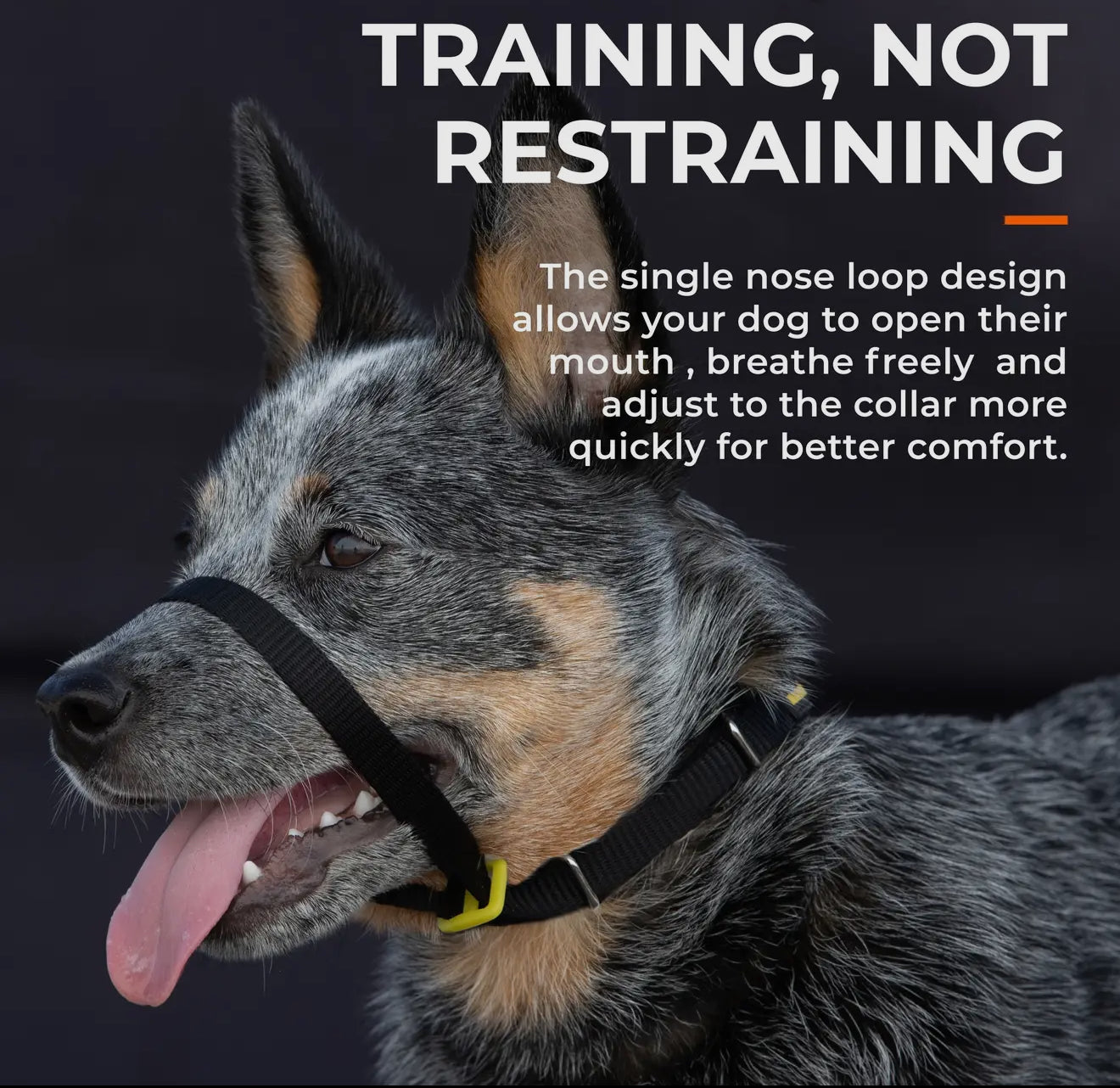 - NO RESTRICTIONS - Self-adjusting, soft nose band adjusts to fit the shape of your dog's face so that she accepts it more easily. Single strap allows her to open her mouth, breathe, pant and drink freely. Won't be confused with a muzzle.
