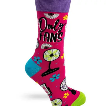 Funny women's novelty crew socks with the saying "Only Fans". Stylish and comfortable! Fits ladies' shoe size 5 to 10. 80% Cotton, 15% Nylon, 5% Spandex. Easy Care - Machine Wash. Item # SK0180