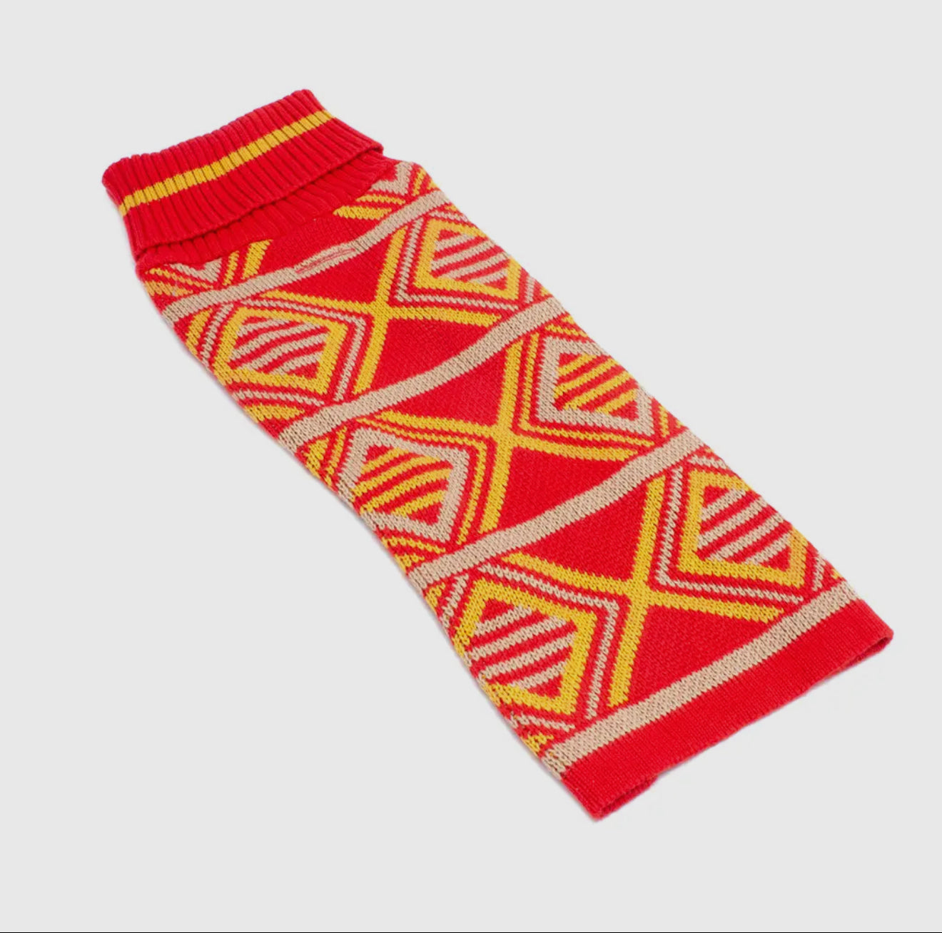 Our luxury dog jumpers are perfect for keeping your four-legged friend cosy this Winter. Make sure your dog is warm and stylish in our 'New Horizons' design dog jumper, in a sophisticated red, mustard and taupe palette. Made from 100% Cotton using 50% recycled yarns, these soft yet hard wearing jumpers can be machine washed after muddy walks. Ethically made in India by Sriniv and his team at an SA800 certified workshop that is also accredited by the Ethical Fashion Forum.